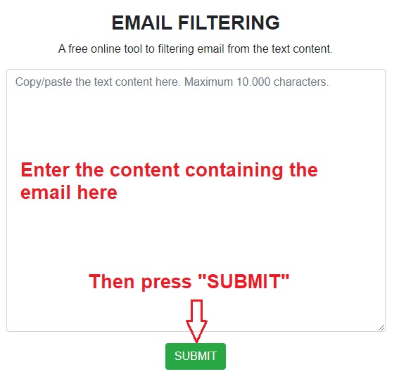 - With the email filter tool, First, you need to visit https://check-emails.net/email-filtering.php and enter anything that contains email in the box, then press SUBMIT.