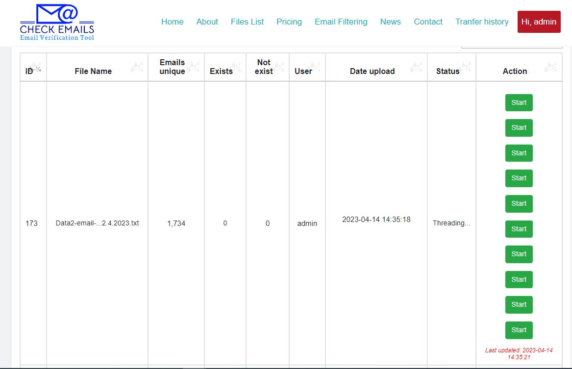 - The Action column will have the last email verification update time, and the Exist and Not Exist columns will have the email continuously updated once an email is verified.